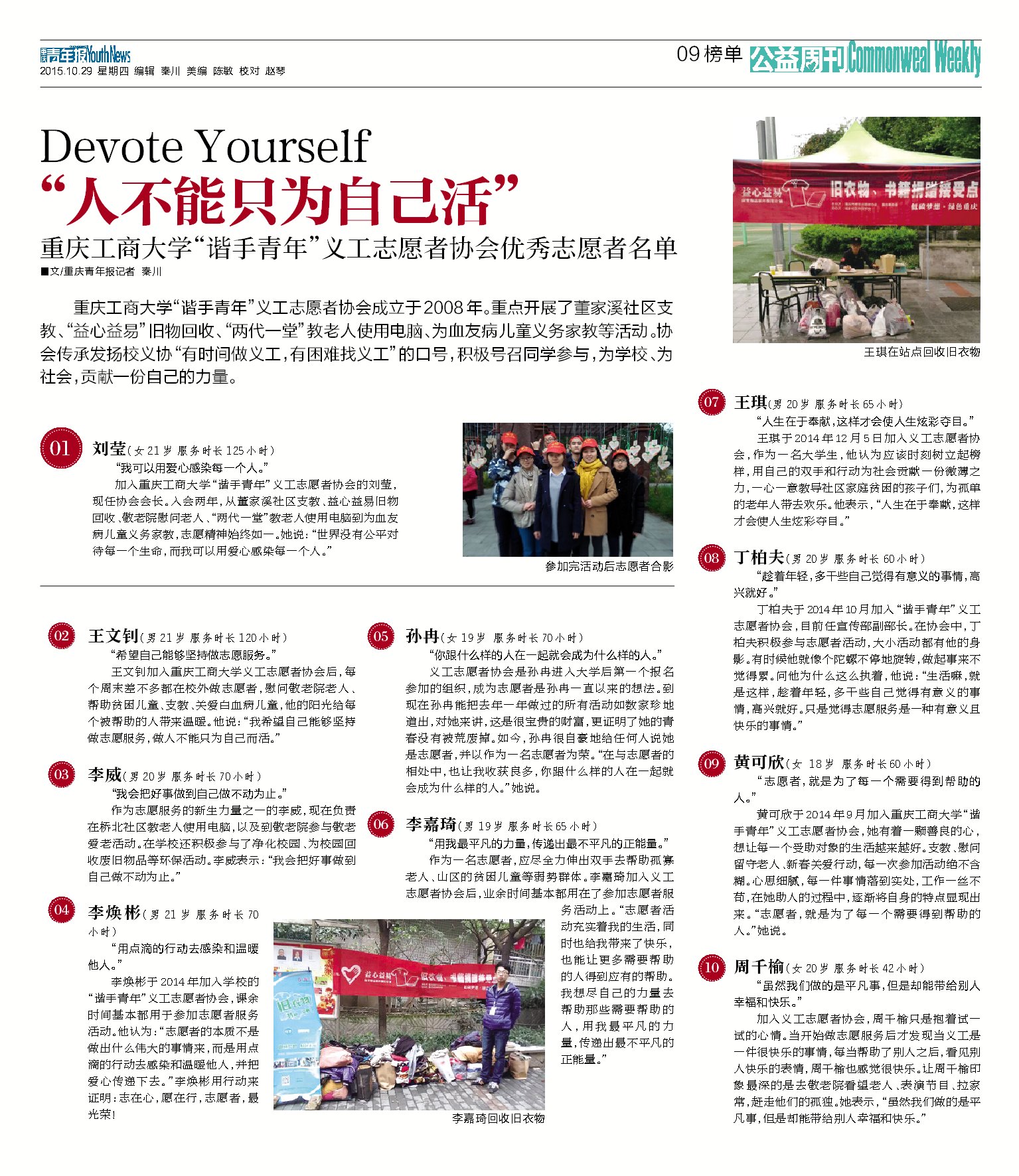 万象城官网艺术学院影视动画分院于2008年成立“谐手青年”义工志愿者协会。一直以来,全体志愿者们全心全意致力于为社会贡献自己的爱心与力量!重点开展了董家溪市民学校支教、“益心益易”旧物回收、“两代一堂”教老人使用电脑、为血友病儿童义务家教等活动。该义协传承校义协“有时间做义工,有困难找义工”的口号,积极号召同学们参与志愿者服务活动,为学校、社会奉献自己的青春和力量。重庆青年报于 2015年10月29日在公益周刊...