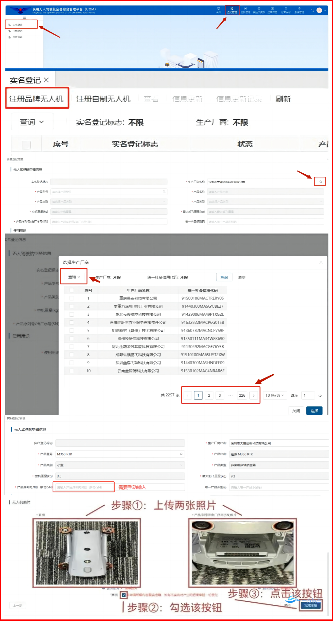 登录好进入首页——点击右上角登记管理——实名登记——注册品牌无人机——验证所有人信息——手机扫码刷脸验证——选择生产商名称(可一页页看,也可直接输入搜索)——选择型号等相关信息(序列号需手动输入)——根据要求长传照片——完成注册。