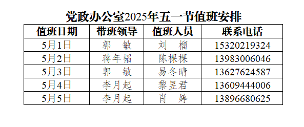 为更好地服务全校师生,保障五一节期间学校相关工作顺利开展,党政办公室每天均安排值班人员,负责学校校章、党委印章、法人印章、学校合同章、党政办公室印章等用印,学校介绍信开具,公文签发审核,会议室申请及使用等工作,请需求单位或师生按规定流程履行签批手续,其他未尽事宜,请与值班老师联系。