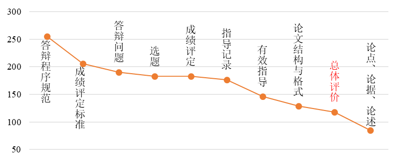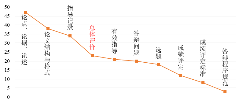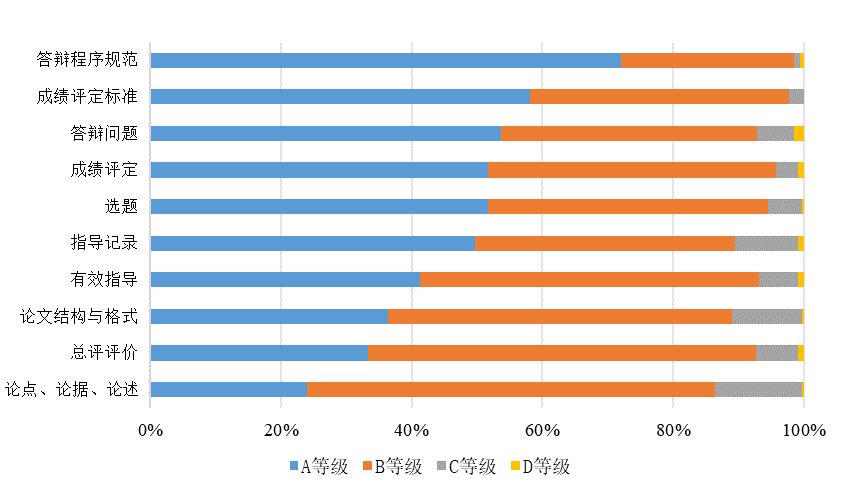本次本科毕业论文(设计)检查共有9+1项评价要点,每项评价要点按照A、B、C、D四个等级进行评价,四个等级分别对应为优、良、及格和不及格。数据统计发现(见表1),118份毕业论文(设计)总体评价为A(优),210份毕业论文(设计)总体评价为B(良),优良率为92.65%;23份毕业论文(设计)总体评价为C(及格),占6.50%;3份毕业论文(设计)总体评价为D(不及格),占0.85%。可以看出,本科毕业论文(设计)质量总体优良。