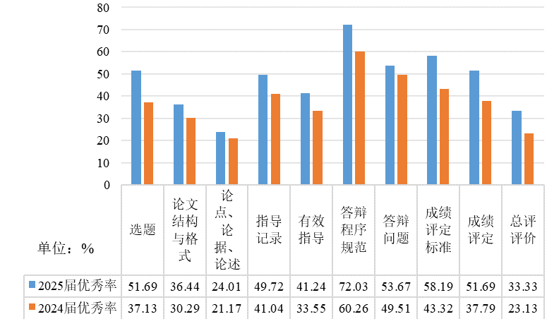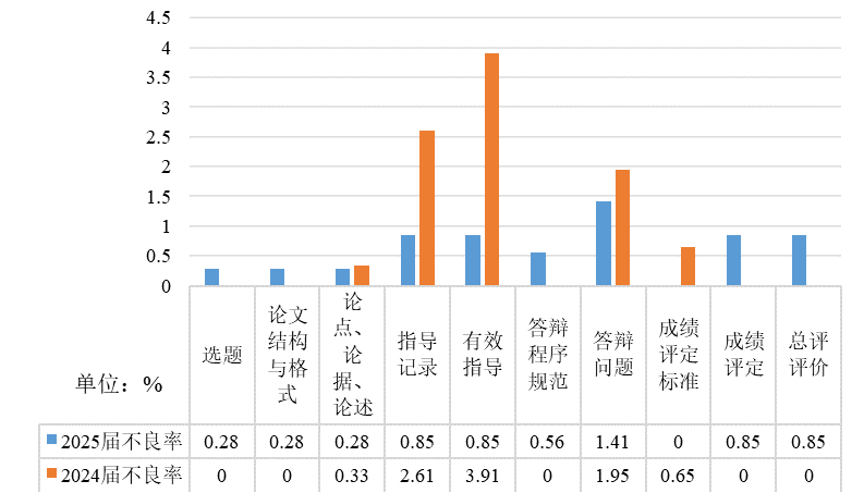通过对比2024-2025学年和2023-2024学年试卷的抽查结果发现,2024-2025学年试卷各项指标的优秀率都有不同程度提高(图6),部分指标的不良率有所改善(图7)。