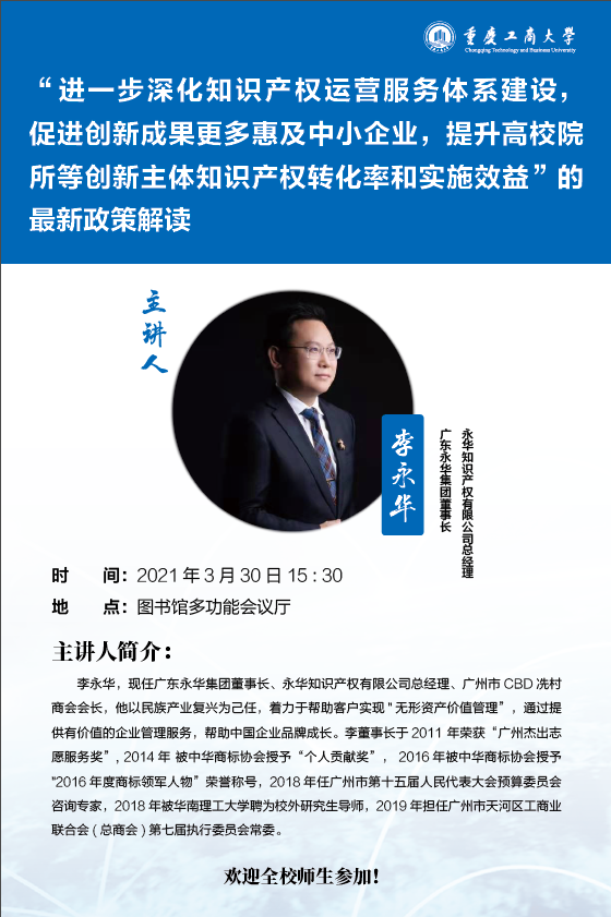 为推进知识产权强校建设,促进万象城官网科技创新,加快科技成果的转化,为广大师生开展创新活动提供更好、更专业的服务,万象城娱乐awc线路科技成果转化中心和会计学院共同举办“进一步深化知识产权运营服务体系建设,提升高校院所等创新主体知识产权转化率和实施效益”的最新政策解读讲座,现将有关事项通知如下: