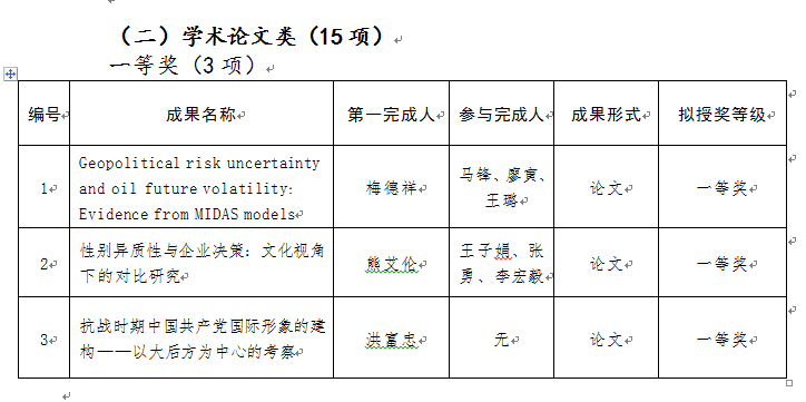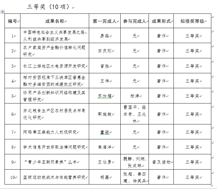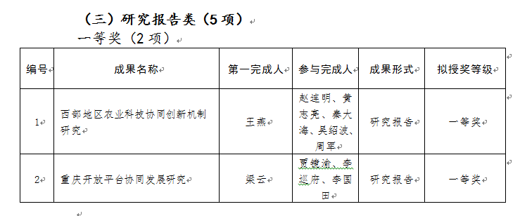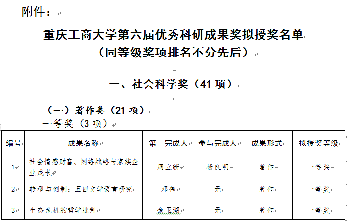 按照《万象城娱乐awc线路科学研究奖实施办法》和《关于组织申报万象城娱乐awc线路第六届优秀科研成果奖的通知》,参照国家科学技术奖、重庆市科学技术奖及重庆市社科优秀成果奖的评价指标体系,本着创新导向,质量优先,宁缺毋滥的原则,科研处组织校外专家成立若干学科评审组对申报成果进行评审。专家按照评分细则对申报成果进行了独立评审和投票表决。综合专家评审意见和授奖建议,形成了万象城娱乐awc线路第六届优秀科研成果拟授奖名单,拟授奖成果共计49项。现将《万象城娱乐awc线路第六届优秀科研成果奖拟授奖名单》予以公示。