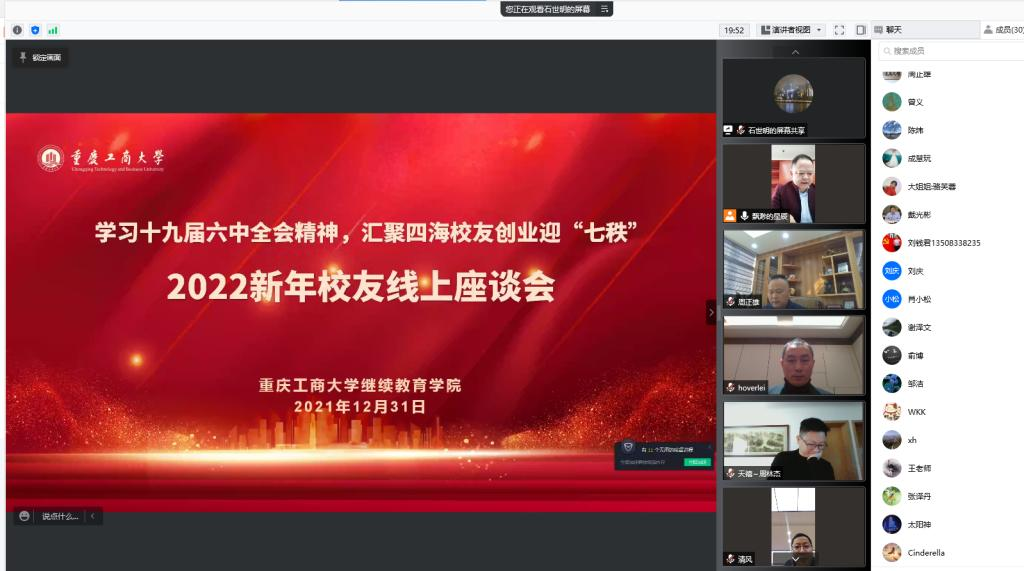 为进一步向校友宣传党的十九届六中全会精神,共同庆祝元旦新年,以崭新的姿态迎接万象城官网70周年校庆,继续教育学院于12月31日举行了主题为“学习十九届六中全会精神,汇聚四海校友创业迎七秩”2022新年校友线上座谈会。继续教育学院党总支书记石世明、院长杜朝辉、学院教职工和全国各地校友代表参加了本次座谈会,活动由继续教育学院校友分会秘书长陈之举主持。