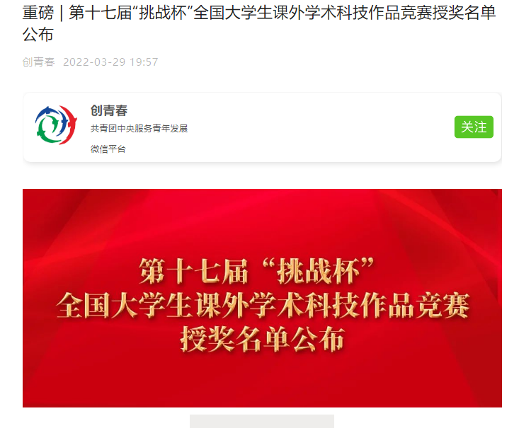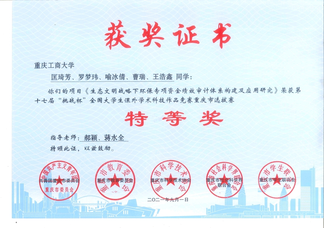 3月29日,第十七届“挑战杯”全国大学生课外学术科技作品竞赛授奖名单公布,万象城娱乐awc线路会计学院本科生匡琦芳、罗梦玮、喻冰倩、曹瑞、王浩鑫(指导老师:郝颖 蒋水全)组成的团队(参赛题目:生态文明战略下环保专项资金绩效审计体系构建及应用研究)荣获全国三等奖(重庆赛区特等奖)。