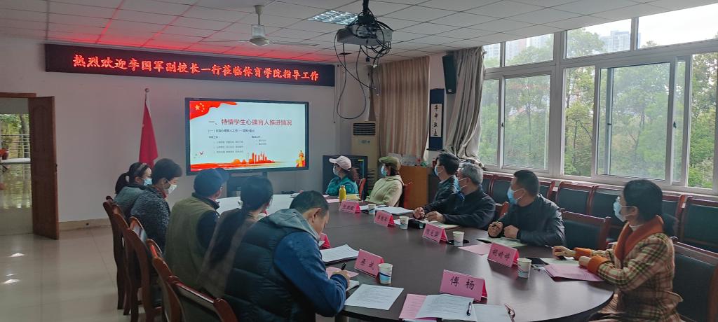 李国军对体育学院提出了几点要求:一是落实疫情防控常态化工作,科学、理性、规范地开展校园疫情防控,守牢安稳底线;二是加强对特情学生的服务与教育管理,认真做好综合研判,凝练好的做法与经验,探索心理育人工作新模式;三是提升思想政治教育的亲和力和针对性,深入学生中寻找“真理”,把思想政治工作做到日常、做到个人,突出育人实效。