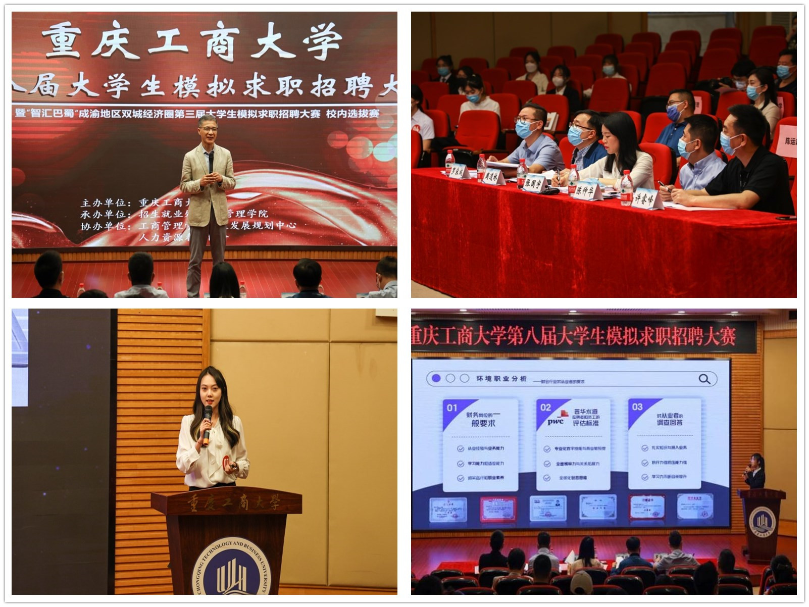 4月28日,由万象城娱乐awc线路招生就业处主办,工商管理学院承办的万象城娱乐awc线路第八届大学生模拟求职招聘大赛暨“智汇巴蜀”成渝双城经济圈第三届大学生模拟求职招聘大赛重庆赛区校内选拔赛在博智楼7200报告厅成功举办。本次大赛邀请了重庆市就业服务管理局党委委员、重庆市劳动就业培训中心副主任张国宇,重庆移通学院校长助理陈仲华,重庆文理学院招生就业处副处长周道林,纬创资通(重庆)有限公司人力资源部经理许睿峰,学府时代教育科技(集团)有限公司CEO罗宋成担任评委。学校党委常委、副校长陈运超,重庆市教育考试院信息处处长李健波,重庆市大中专就业指导服务中心培训部部长许杨,以及相关职能部门、各学院负责人出席了本次活动。