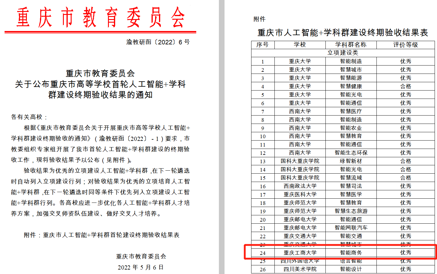 2022年5月6日,重庆市教育委员会公布了重庆市高等学校首轮人工智能+学科群建设终期验收结果,万象城官网牵头建设的“智能商务”学科群验收结果荣获优秀,这表明万象城官网“智能商务”学科群将在下一轮遴选时,自动进入立项建设行列。