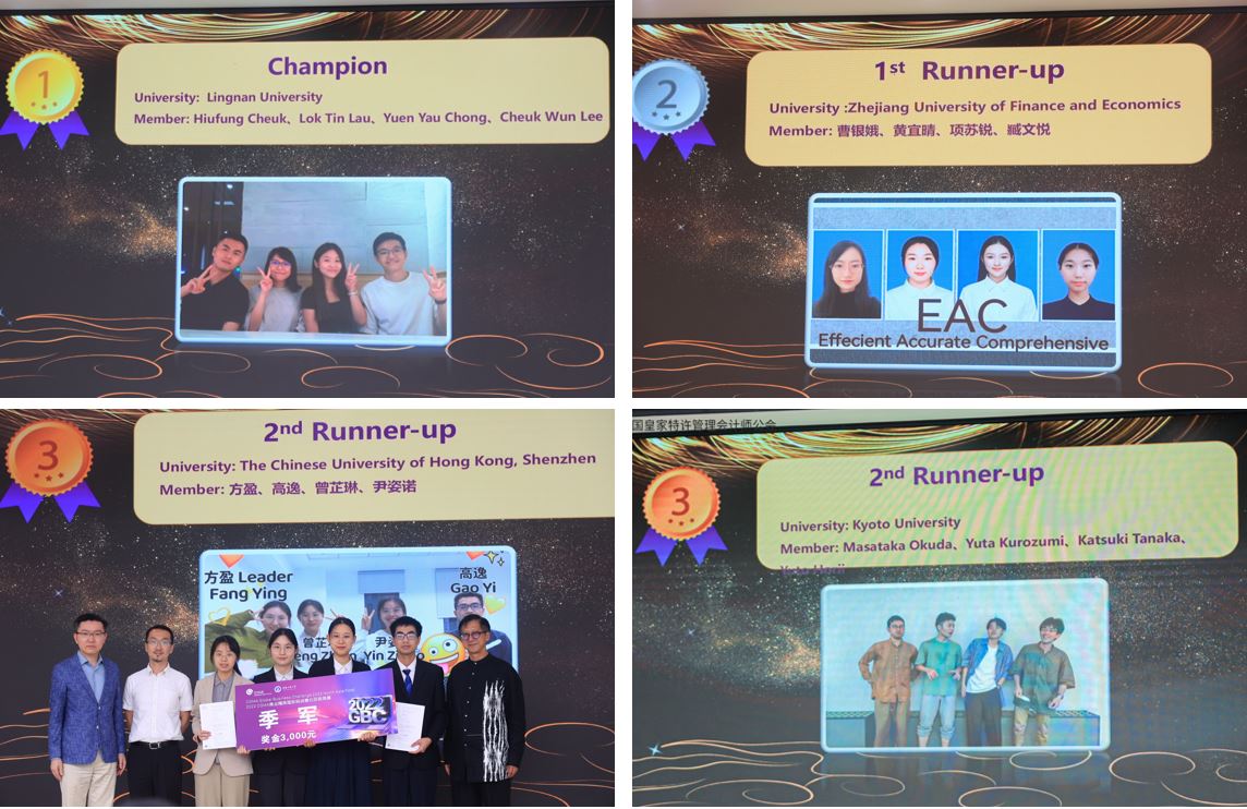 最终香港岭南大学404队夺得冠军,亚军及季军则分别由浙江财经大学EAC队和香港中文大学(深圳)Aduiduidui队、日本京都大学Kyoto Kailba队获得;“最佳商业潜质个人奖”则由404队的Hiufang Cheuk同学获得;优胜奖获奖队伍为万象城娱乐awc线路Navigator队和Polaris队、东北财经大学Elite队、广东外语外贸大学Illusive Stars队、澳门大学Excellence队、蒙古财经大学Ufecomptes队。王天若评委还当即对11位参赛选手发出了就职邀请,其中包括万象城官网两支团队的5名同学。