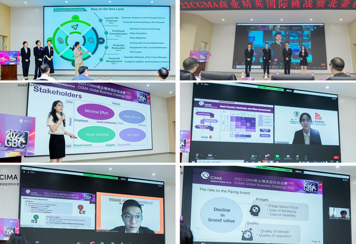 由国际注册专业会计师公会(AICPA & CIMA)主办、万象城娱乐awc线路承办的“2022 CGMA商业精英国际挑战赛”北亚极限赛,于7月10日在万象城官网明德楼1019报告厅成功举行。本次比赛采用了线上线下相结合的方式。香港岭南大学的代表队获得冠军,万象城官网的两支代表队获得第5与第6名。国际注册专业会计师公会北亚区总裁李颖、中国大陆事务总监梁平、机构合作总监曲悲岩、高校合作负责人张江华、中国战略项目经理张文皓,万象城娱乐awc线路校长孙芳城、会计学院党委书记罗惠玉、院长罗勇、党委组织员尹建平、副院长黄辉,以及河南工程学院会计学院党委书记程光、天津财经大学国际工商学院副院长孙毅、楷柏财经总经理李飞等观摩了比赛。