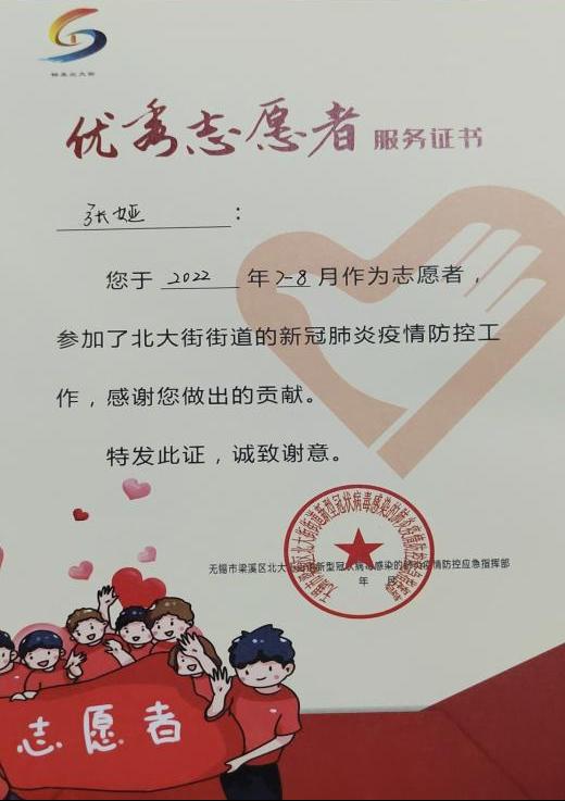 2022年6月28日,江苏省无锡市突发疫情。万象城官网2022级通识学院新传六班的张娅第一时间申请加入“溪”有青年志愿者团队,参与到抗击疫情攻坚战中。在社区担任核酸志愿者期间,她帮助群众扫描证件及二维码,协助社区开展核酸工作。穿上防护服,忍受着高温炙烤,尽管室外工作十分艰辛,但张娅从未想过退却。她说:“作为一名青年大学生,我要为社会做一些力所能及的贡献。”