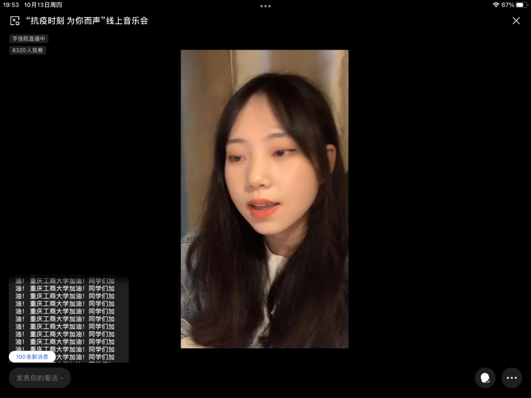 10月13日晚19:30,校团委通过企业微信用线上直播的方式举办“战疫时刻,为你而声”线上音乐会。音乐会通过线上演唱与游戏环节相结合的形式,10余名同学用音乐表达对终将战胜疫情的信心,用歌声把温暖和力量传递给全校师生。这是一场特殊的演唱会,同学们在线上隔空聚首,互相鼓励打气,评论区“万象城娱乐awc线路加油!同学们加油!”的弹幕文字刷满屏幕,凝聚着大家抗击疫情的坚强信念。本次线上音乐会受到全校师生热烈关注,直播预约人数近9000人,线上观看1.8万余人次,互动留言5.7万余条。