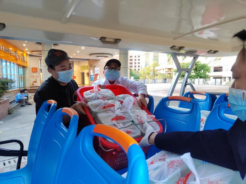 早上6:30,包子、馒头、牛奶……已经准备妥当,为在校师生一天的工作、学习和生活蓄能。半小时后,食堂员工们抬着一箱箱分装好的早餐开始装车。“小心点儿,不要掉了”“你那边高一点,好,往里推”一份份冒着热气的早餐乘坐着“小飞车”开启了它们的旅程。为了确保学生能尽快吃上饭,食堂工作人员还热心地跟车送饭,帮助志愿者们把早餐送到学生楼栋。