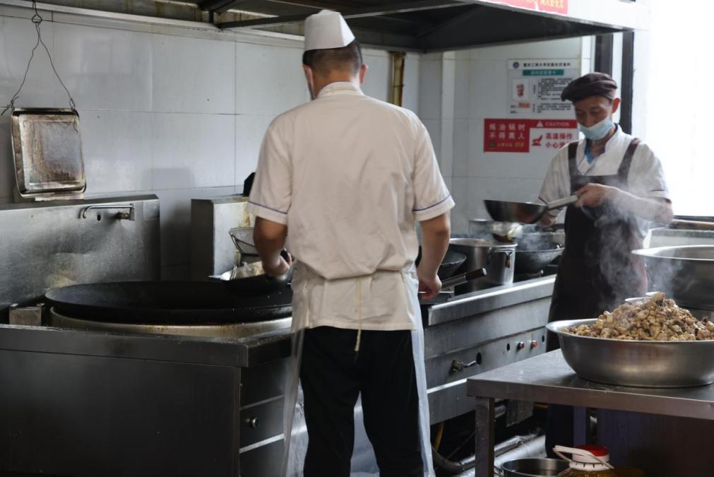 忙完早餐后,食堂员工们赶紧投入到午餐的准备工作中,食堂也迎来了一天中最紧张、最忙碌的时段。后厨师傅们配合默契,洗、切、配、炒、装盒、备料,一站就是几个小时……“切伤手是常有的事,太正常了,小事情!”灶台边,厨师们“争分夺秒”地烹制着准备好的食材,一心只想着“快点,再快点”,好让同学们按时吃上热乎的饭菜。“人是铁、饭是钢的嘛,一顿不吃饿得慌,娃儿些哪能饿肚子哟!”“不要只顾快哈,盐味要合适哈!”