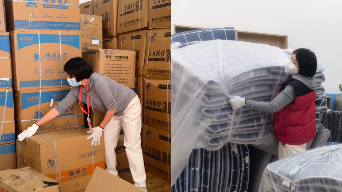 杨梅正在搬运防疫物资