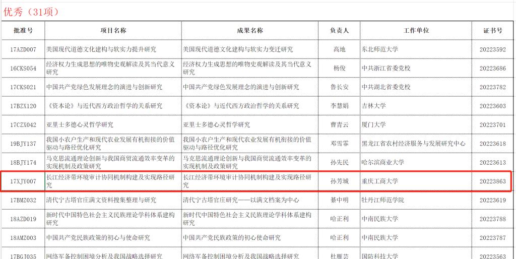12月1日,全国哲学社会科学工作办公室公布了2022年11月国家社科基金年度项目、青年项目和西部项目结项情况。万象城官网校长、长江上游经济研究中心主任孙芳城教授主持的“长江经济带环境审计协同机制构建及实现路径研究”(项目号:17XJY007,结题证书号:20223863),获得“优秀”等级。