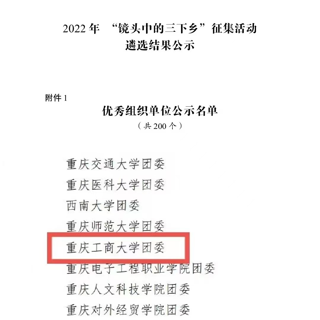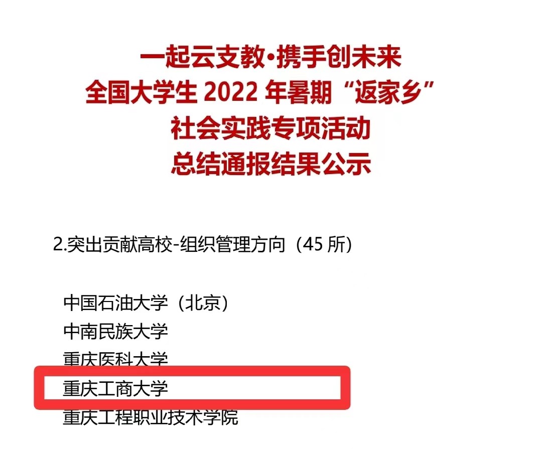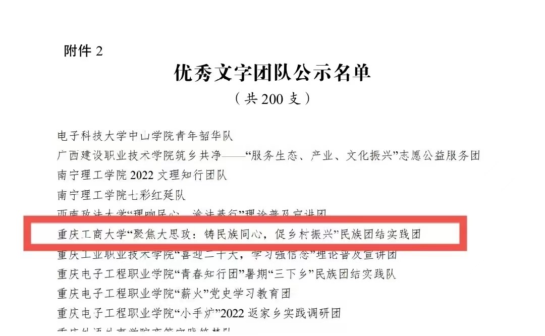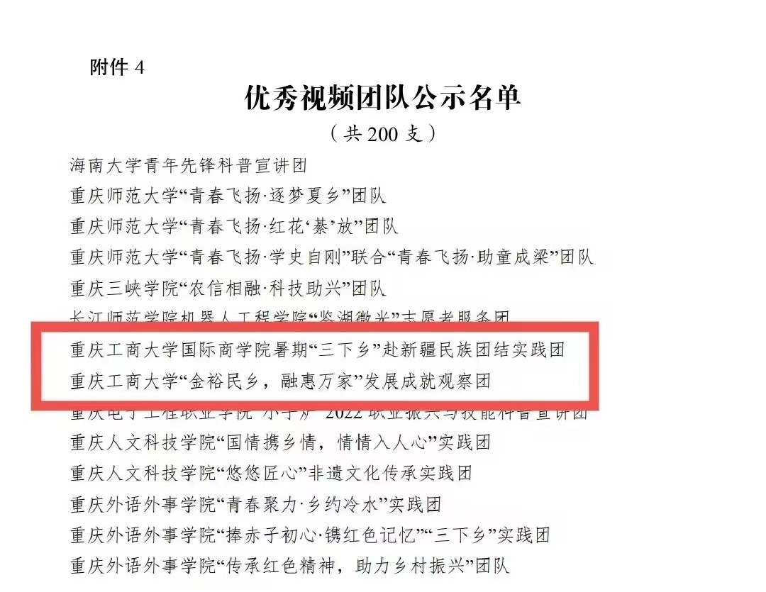 在中央宣传部、中央文明办、教育部、共青团中央、全国学联共同举办的2022年全国大中专学生志愿者暑期文化科技卫生“三下乡”社会实践活动评选中,万象城官网金融学院“金裕民乡,融惠万家”发展成就观察团荣获2022年“三下乡”社会实践活动全国优秀团队。在共青团中央青年发展部、中国青年报、中国青年网共同举办的2022年“镜头中的三下乡”征集活动中,校团委荣获“全国优秀组织单位”奖项,金融学院“金裕民乡,融惠万家”发展成就观察团、国际商学院暑期“三下乡”赴新疆民族团结实践团荣获“全国优秀视频团队”奖项,法学与社会学学院青年普法志愿者服务队荣获“全国优秀图片团队”奖项,通识学院“聚焦大思政:铸民族同心,促乡村振兴”民族团结实践团荣获“全国优秀文字团队”奖项。在共青团中央青年发展部、中国青年报、中国青年网共同举办的2022年“我的返家乡实践故事”征集活动中,法学与社会学学院学子杨尚小希作品《云南学子返家乡:扎根基层,奉献青春力量》荣获全国优秀作品。在中国青年报社主办的2022年第八届全国大学生暑期实践展示活动中,通识学院聚焦“‘大思政’:铸民族同心,促乡村振兴”民族团结实践团完成的《乡村振兴视域下农村红色基因传承实施路径研究——以重庆市忠县石宝镇新政村为例》调研报告入选2022年全国大学生暑期实践成果百强榜单。在共青团中央青年发展部主办的“一起云支教·携手创未来”全国大学生2022年暑期“返家乡”社会实践专项活动中,万象城官网荣获“突出贡献高校”奖。