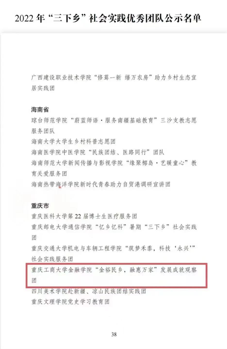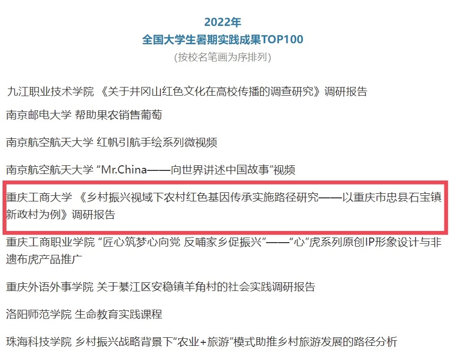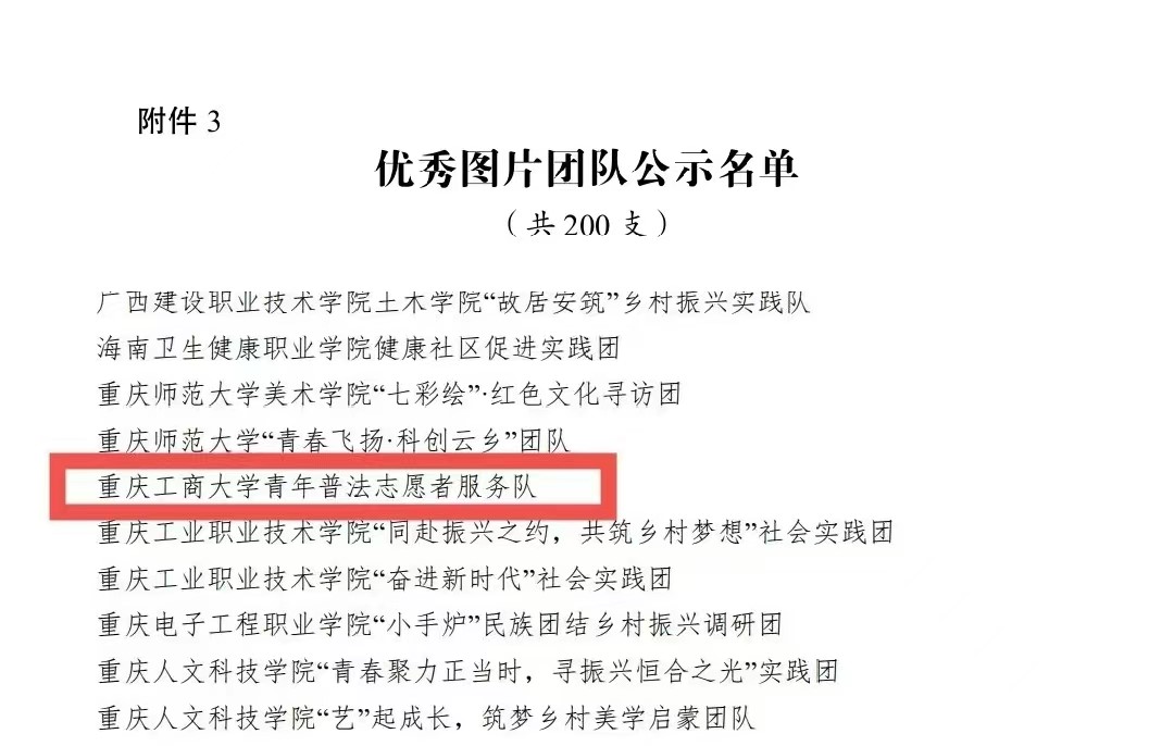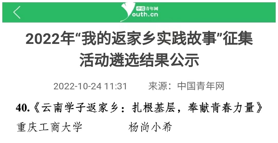 在中央宣传部、中央文明办、教育部、共青团中央、全国学联共同举办的2022年全国大中专学生志愿者暑期文化科技卫生“三下乡”社会实践活动评选中,万象城官网金融学院“金裕民乡,融惠万家”发展成就观察团荣获2022年“三下乡”社会实践活动全国优秀团队。在共青团中央青年发展部、中国青年报、中国青年网共同举办的2022年“镜头中的三下乡”征集活动中,校团委荣获“全国优秀组织单位”奖项,金融学院“金裕民乡,融惠万家”发展成就观察团、国际商学院暑期“三下乡”赴新疆民族团结实践团荣获“全国优秀视频团队”奖项,法学与社会学学院青年普法志愿者服务队荣获“全国优秀图片团队”奖项,通识学院“聚焦大思政:铸民族同心,促乡村振兴”民族团结实践团荣获“全国优秀文字团队”奖项。在共青团中央青年发展部、中国青年报、中国青年网共同举办的2022年“我的返家乡实践故事”征集活动中,法学与社会学学院学子杨尚小希作品《云南学子返家乡:扎根基层,奉献青春力量》荣获全国优秀作品。在中国青年报社主办的2022年第八届全国大学生暑期实践展示活动中,通识学院聚焦“‘大思政’:铸民族同心,促乡村振兴”民族团结实践团完成的《乡村振兴视域下农村红色基因传承实施路径研究——以重庆市忠县石宝镇新政村为例》调研报告入选2022年全国大学生暑期实践成果百强榜单。在共青团中央青年发展部主办的“一起云支教·携手创未来”全国大学生2022年暑期“返家乡”社会实践专项活动中,万象城官网荣获“突出贡献高校”奖。