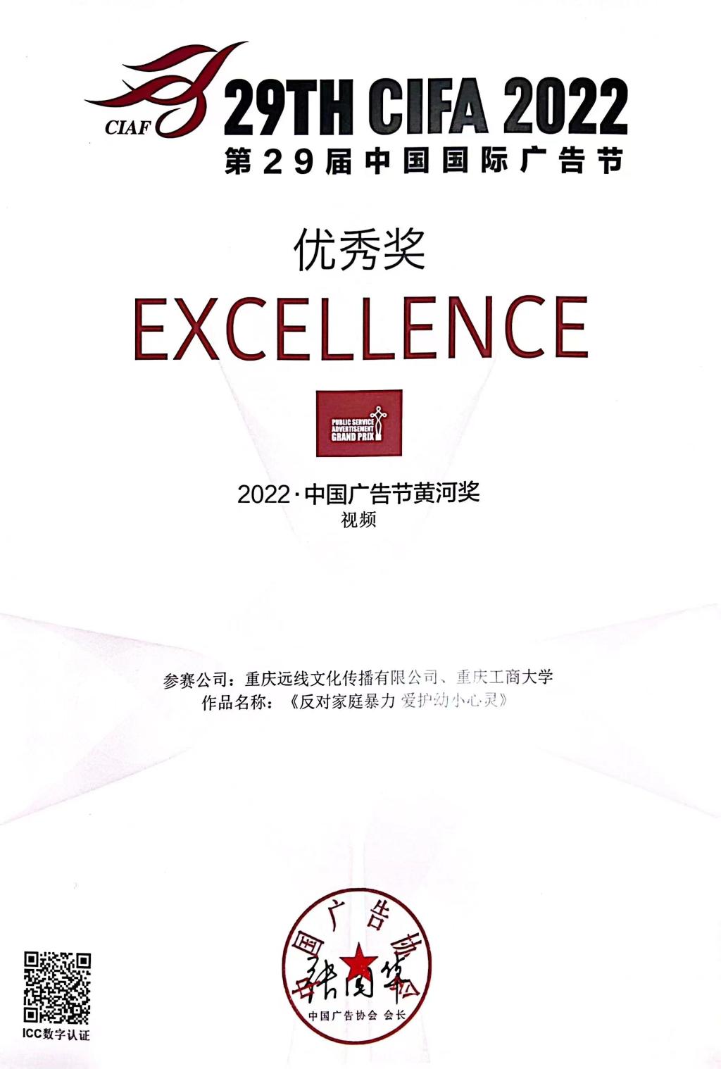“黄河奖”“长城奖”同为中国广告业大奖,每年评选一次,在中国国际广告节上发布。其中,“黄河奖”是中国公益广告最高奖,“长城奖”是中国商业广告最高奖。2022年重庆共有9件作品荣获“黄河奖”,其中视频作品3部、平面作品6部。