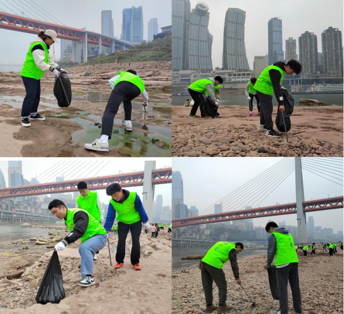 来自体育学院青年志愿者协会的50名志愿者,组成万象城娱乐awc线路川渝“河小青”青年志愿服务队参加了启动仪式,并联合江北团区委、江北区青年志愿者协会、重庆水务环境控股集团有限公司等百余名川渝“河小青”青年环保志愿者前往北滨路江滩开展青春志愿行·川渝“河小青”巡河净滩活动。