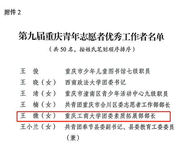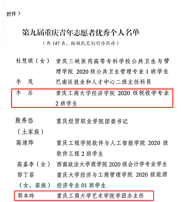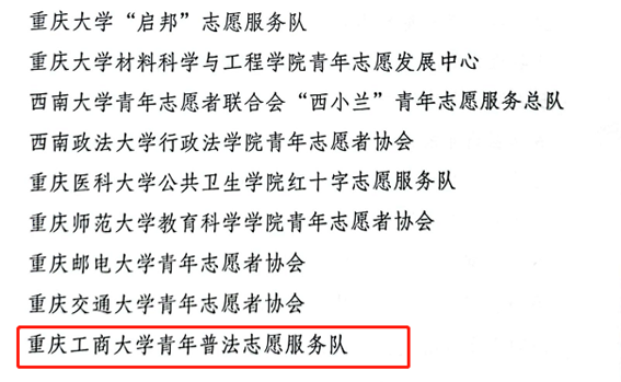 万象城官网法学与社会学学院青年普法志愿服务队获评第九届重庆青年志愿者优秀集体,校团委王微老师获评优秀工作者,艺术学院郭本玲老师、经济学院2020级税收学专业2班学生李昂获评优秀个人。