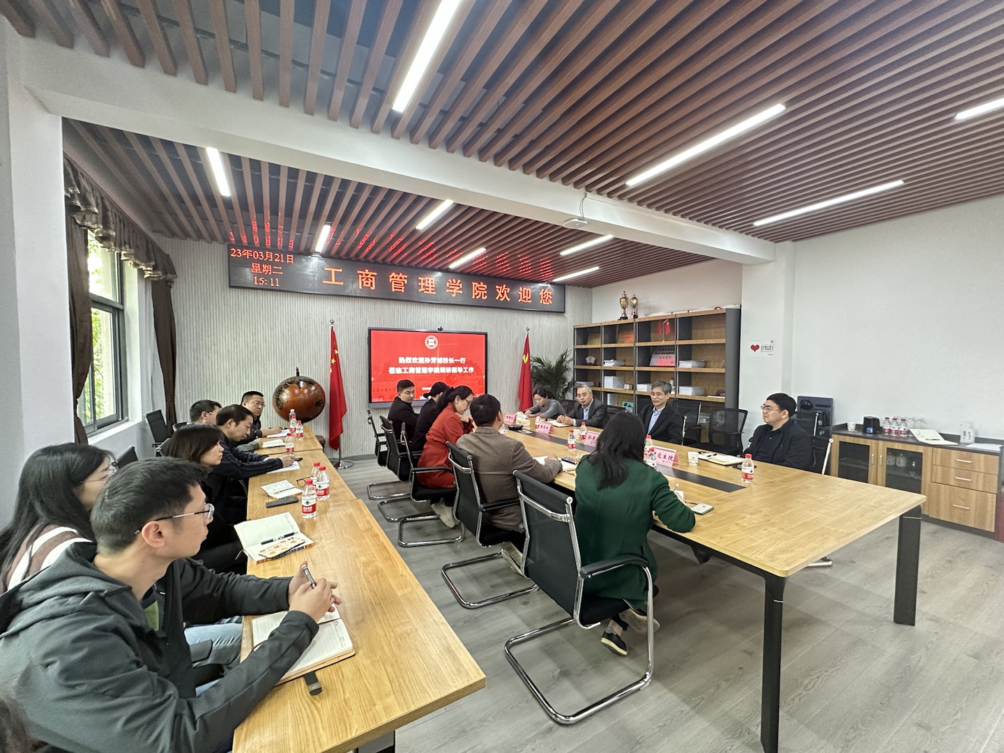 3月21日下午,校党委副书记、校长孙芳城带领教务处、科研处和研究生院相关负责人到工商管理学院调研指导工作。学院党政班子成员、各系主任、科室负责人参加了调研会议。
