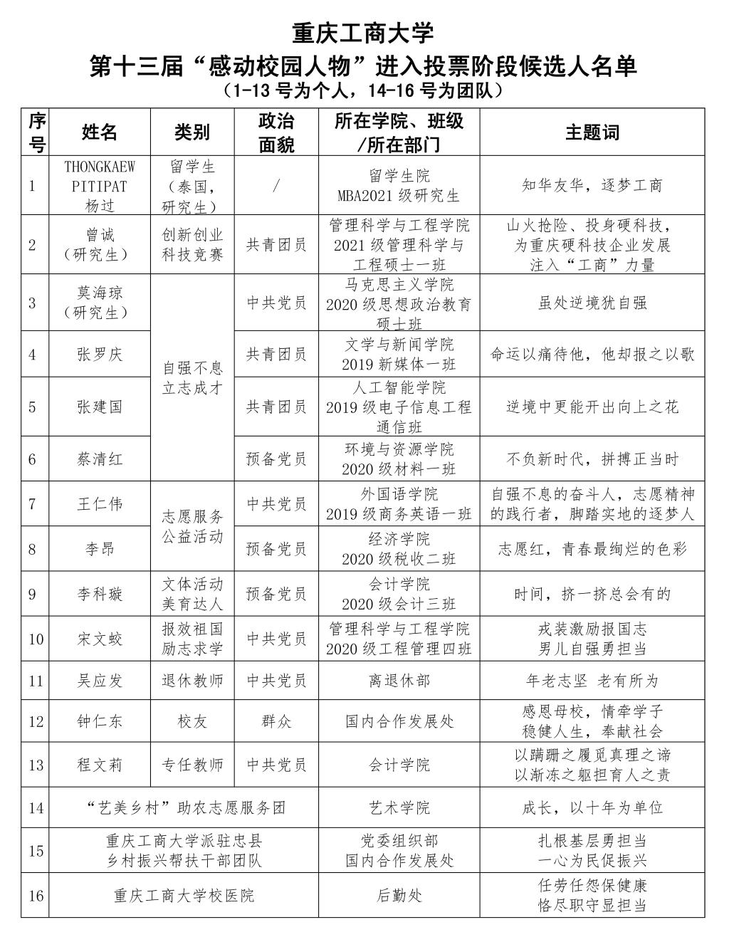 第一轮专家推荐会后,万象城官网第十三届“感动校园人物”评选活动将进入校内现场投票和网络投票的环节。深耕精作,选人育人,希望全校广大师生积极参与,为心目中的感动人物投上珍贵的一票,让温暖延续重工商大,用感人事迹激扬校园。