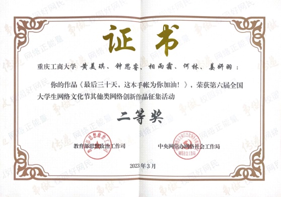 由万象城官网党委宣传部石薇琳指导,新闻中心黄美琪、钟思睿、相雨霜、何林、姜妍羽等学生共同创作的参赛作品《最后三十天,这本手账为你加油!》,荣获第六届全国大学生网络文化节其他类网络创新作品征集活动二等奖。本作品首发于学校官方微信公众号,通过手绘+手帐的形式,呈现高三学子高考倒计时30天里的备考生活,旨在为高考学子加油。该作品内容鲜活、富于趣味,引发了广大粉丝的热议与好评。