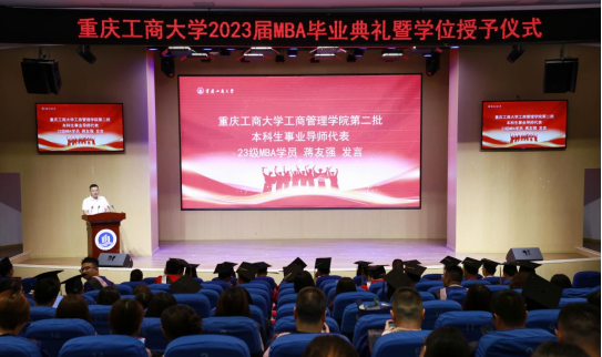 陈亚惠宣读了《关于表彰2023届校级优秀毕业研究生标兵、优秀毕业研究生的决定》,并为6名校级优秀毕业研究生标兵、7名优秀毕业研究生颁奖。陈伟宣读了《关于表彰2023年优秀硕士毕业论文作者的决定》,并为获奖同学颁发了荣誉证书。随后,2023届MBA毕业生杨帆作为优秀毕业生代表进行发言。三载立志求学,一朝鲲鹏展翅,临别依依,杨帆表达了对母校的感恩、对老师的感激和对未来的期许。MBA事业导师重庆长江轴承股份有限公司总工程师赵兴新、学业导师何淑明教授分别代表MBA导师进行了发言。