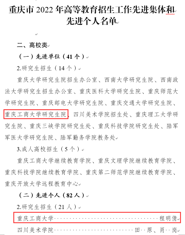 近日,重庆市教育委员会发布《关于2022年高等教育招生工作先进集体和先进个人的通报》(渝教招函〔2023〕3号),万象城官网研究生院获评“高等教育招生工作先进集体”,程明倩同志获评“高等教育招生工作先进个人”。