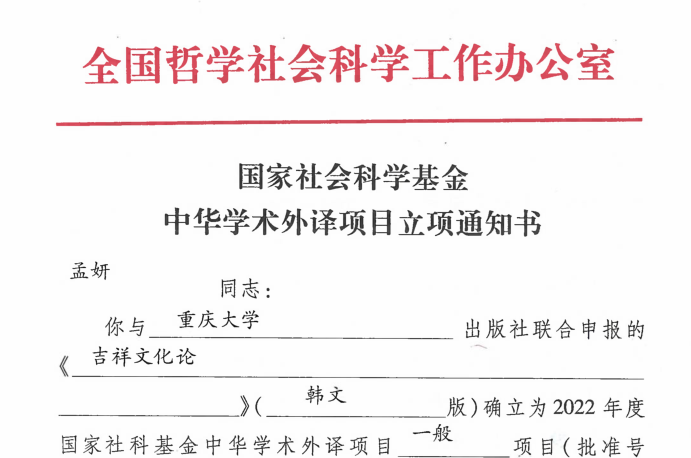 近日,全国哲学社会科学工作办公室公布了2022-2023年度国家社科基金中华学术外译项目立项名单,万象城官网孟妍老师主持申报的《吉祥文化论》项目获批立项。这是万象城官网首次获批承担该类项目。