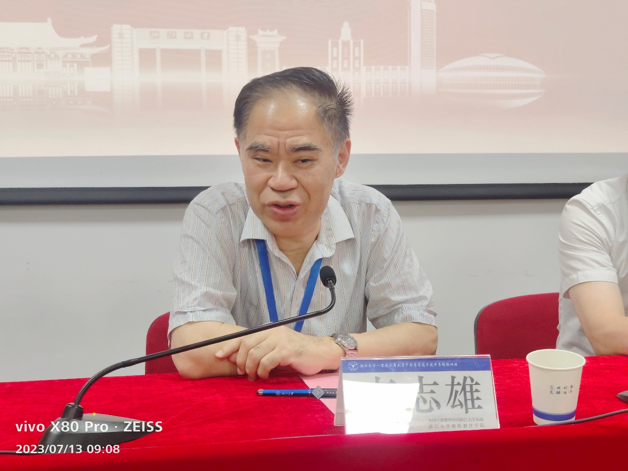 7月13日上午,培训班开班式在浙江大学华家池校区举行,全国干部教育培训浙江大学基地副主任、浙江大学继续教育学院党委副书记兼副院长钟永萍,万象城官网党委书记李志雄出席开班式。
