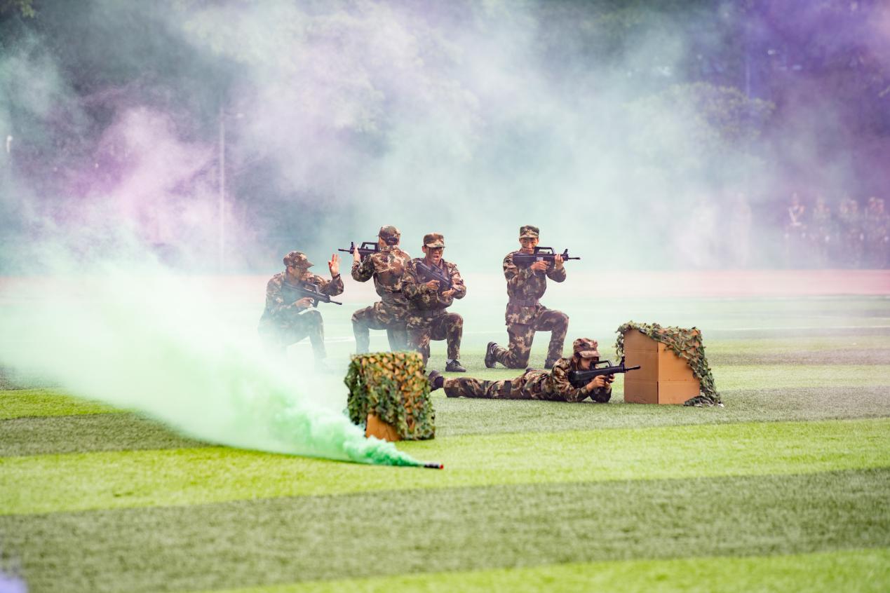 动感十足、活力四射的韵律操,将运动与艺术完美结合,充分展现了青春的风采与魅力;“利刃出鞘淬刀锋,杀声阵阵展血性。”铿锵有力的捕俘拳,勇猛矫健的军体拳,动作精炼、节奏分明的捕俘刀表演,尽显军训学子坚韧不拔、勇敢顽强的战斗作风;手握钢枪、目光灼灼、脚步轻捷的战术小组带来了一场精彩的反恐表演;动如腾龙出海,静似猛虎卧山。刺杀操方阵以最嘹亮的呐喊声为整片会场增添了一抹雄壮的色彩,一招一式尽显工商学子的豪迈气概;队列操方阵手持红黄两色纸板,通过颜色和动作改变,变换出“CTBU”“1952-2023”“厚德博学 求是创新”“爱国 诚信 和谐 奋进”“勤学善思 求真笃行”等字样和党旗、中国地图等图案,伴随着《祖国不会忘记》的歌声响起,队形收拢。