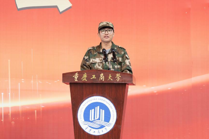 军训学员代表、公共管理学院2022级本科生焦焱琦发言。他回顾了过去两周的军训生活,对教官和老师的指导陪伴表示了衷心的感谢和崇高的敬意,表示会将军训中的收获和精神带到今后的人生发展中,在接下来的三年学习中,充分利用学校提供的广阔平台,勇于挑战自我,认真投入地学习,丰富精彩的生活,争做有理想、敢担当、能吃苦、肯奋斗的新时代好青年,让青春在祖国最需要的地方绽放绚丽之花。