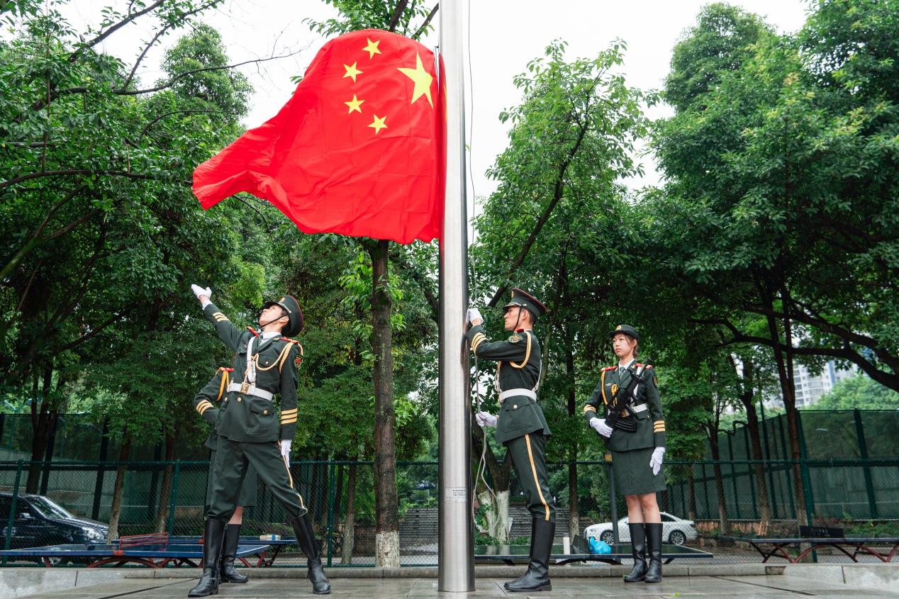 在庄严的国歌声中,鲜艳的五星红旗冉冉升起,军训总结表彰大会正式拉开帷幕。大会由军训成果汇报和总结表彰两部分组成。