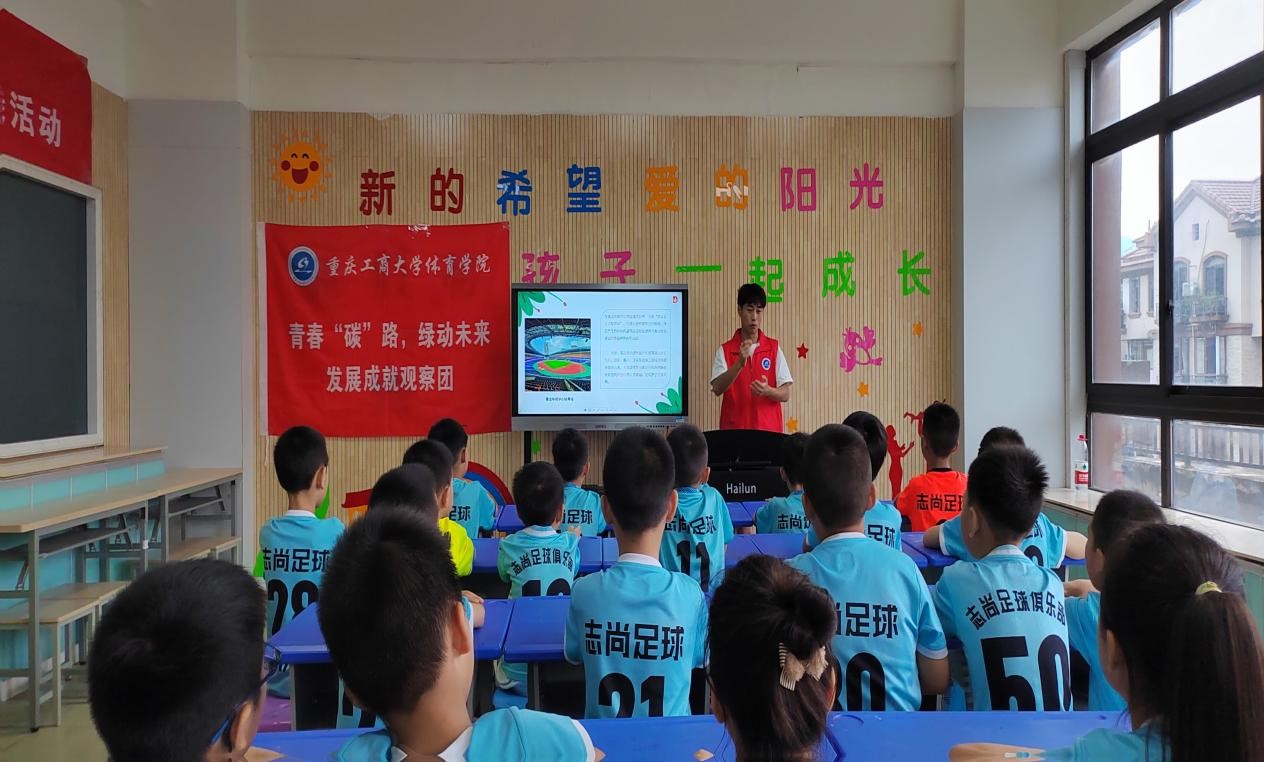 7月12日,体育学院“青春碳路,绿动未来”发展成就观察团在重庆市黔江区青少年活动中心开展“勇做‘碳’路先锋 共创绿动未来”全国低碳日主题宣传活动。实践团开展低碳环保小课堂授课活动,科普生态环境知识;带领儿童参观黔江区生态文明教育场馆,观摩黔江生态地图,体验骑行发电与3D打印技术。此外,实践团结合专业特色,开展趣味“碳”足迹宣讲活动。宣讲内容涵盖红色体育文化与体育运动竞赛规则等环节。实践团成员们精心准备授课内容,用心设计绿色低碳运动会项目,给孩子们带来了一堂妙趣横生的体育课,帮助他们在学中做、做中悟,努力成为低碳生活绿色出行的倡导者、宣传者和实践者。同时,实践团还将奥运精神、女足精神与女排精神讲给孩子们听,让勇于拼搏的榜样力量浸润青少年心灵,激励他们奋发向上,争做新时代好少年。