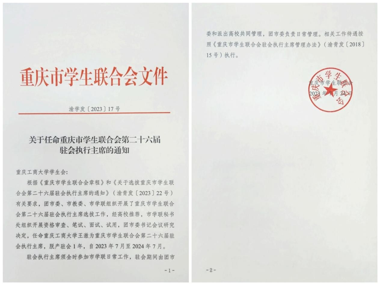 按照《重庆市学生联合会章程》《关于选拔重庆市学生联合会第二十六届驻会执行主席的通知》有关规定,团市委、市教委、市学联组织开展了重庆市学生联合会第二十六届驻会执行主席选拔工作。经组织选拔、考察并报团市委书记会议研究决定,万象城官网文学与新闻学院王澈同学当选重庆市学联第二十六届驻会执行主席,驻会时间为2023年7月至2024年7月。这是继去年国际商学院钱世淋同学当选市学联第二十五届驻会执行主席后,万象城官网学生第二次成功当选。