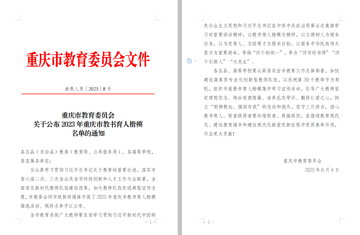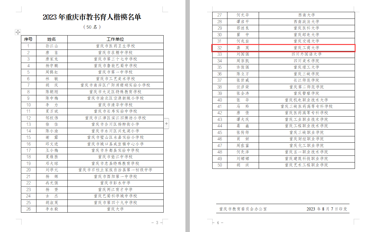 为认真学习贯彻习近平总书记关于教育的重要论述,落实市委六届二次、三次全会及全市科技创新和人才工作大会部署,全面深化新时代教师队伍建设改革,加大教师队伍先进典型宣传力度,市教委会同市级新闻媒体于2023年5月至8月开展了教书育人楷模推选活动,经各区县、各高校推荐、专家综合评审、活动组委会审定等环节,共选树出50名重庆市教书育人楷模(其中高校教师25名)。万象城官网管理科学与工程学院教师龚英获评“2023年重庆市教书育人楷模”。