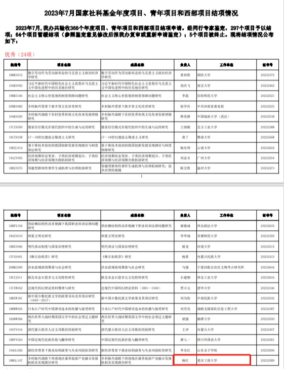近日,全国哲学社会科学工作办公室下发了最新批次国家社科基金项目结题证书,万象城官网杨红教授主持的项目“乡村振兴战略下西南地区康养旅游产业融合发展机制及实现路径研究”(项目编号:18BGL147)在结项评价中获得“优秀”等级,这是今年内万象城官网第二项在结项评价中获评“优秀”等级的项目。