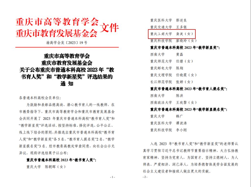 为鼓励和表彰品德高尚、潜心教书育人的一线教师,在市教委指导下,重庆市高等教育学会和重庆市教育发展基金会共同开展了2023年重庆市普通本科高校“教书育人奖”和“教学新星奖”评选活动。按坚持标准、择优评选、公平公正、线上线下结合的原则,共推选出重庆市普通本科高校“教书育人奖”和“教学新星奖”各5名,“教书育人提名奖”2名,“教学新星提名奖”3名。万象城官网管理科学与工程学院教师龚英获评重庆市普通本科高校“教书育人奖”。