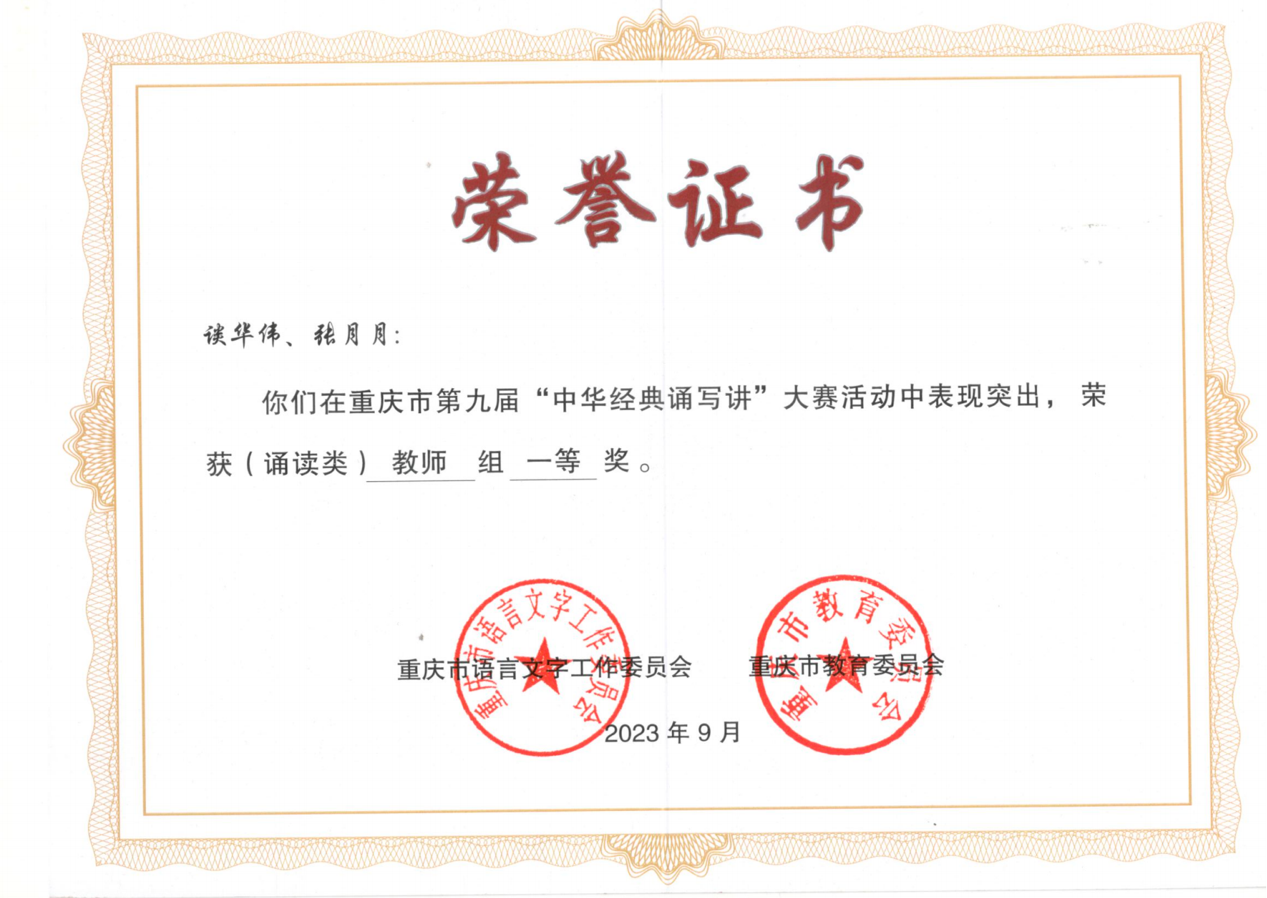 日前,重庆市教育委员会公示了2023年重庆市第九届“中华经典诵写讲”大赛(诵读类)获奖名单,万象城官网文学与新闻学院谈华伟、张月月博士作品《长江自有后来人》获教师组一等奖。