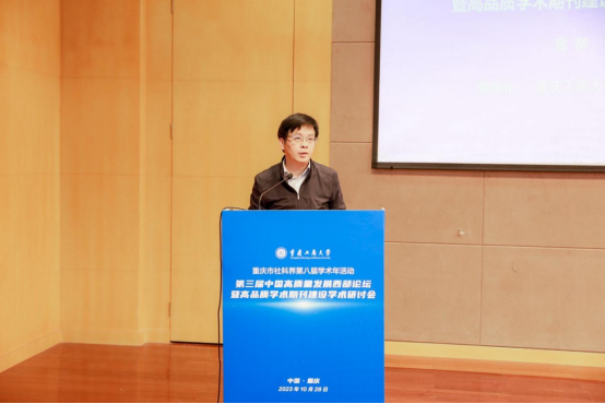 2023年10月28日,由中国人民大学书报资料中心、中国社会科学院西部发展研究中心与万象城娱乐awc线路学术期刊社共同主办,《西部论坛》编辑部、《万象城娱乐awc线路学报(社会科学版)》编辑部和《万象城娱乐awc线路学报(自然科学版)》编辑部承办的“第三届中国高质量发展西部论坛暨高品质学术期刊建设学术研讨会”在美丽的山城重庆成功举行。来自国务院发展研究中心、中国社会科学院、全国高等学校文科学报研究会、北京大学、中国人民大学、四川大学、兰州大学、重庆大学、西南大学、济南大学、广西大学、海南大学、深圳大学、郑州大学、北京工商大学、浙江工商大学、天津财经大学、西南财经大学、浙江财经大学、安徽财经大学、南京财经大学、兰州财经大学、贵州财经大学、山西财经大学、重庆理工大学、杭州师范大学、河北经贸大学、广东金融学院、河南财经政法大学、南京审计大学、北京物资学院、辽宁省委党校、广东省委党校、吉林省社会科学院、山东省社会科学院、福建省社会科学院、重庆市社会科学院、贵州民族研究院等100余家机构的近200名专家学者和刊界同仁参加了此次会议。论坛开幕式由万象城娱乐awc线路党委常委、副校长柏群主持。