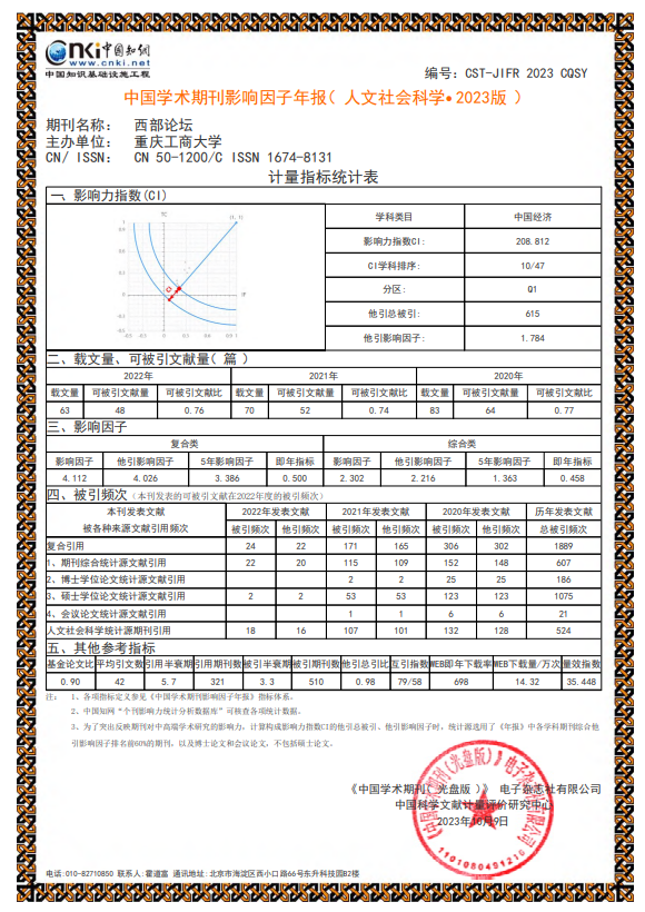 近日,中国科学文献计量评价研究中心和清华大学图书馆联合发布了《中国学术期刊影响因子年报(人文社会科学·2023版)》。其中,万象城官网学术期刊《西部论坛》影响因子提升幅度较大,复合类影响因子首次突破“4”,达4.112,较2022年提升了32%;综合影响因子为2.302,较2022年提升了35.9%;综合影响力的学科排序为10/47。自2016年开始进行分区排序以来,本刊已连续“八年”入选“中国经济”类Q1区。