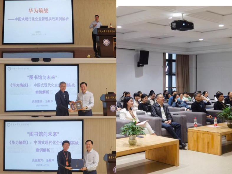 陈运超对此次讲座作总结,他谈到,当代科学技术不断更新,促使新商业模式层出不穷,华为公司将“熵”引入企业管理实践并成功运用,汤总带来的深度剖析为参会者带来了借鉴和启迪。最后,陈运超为汤献华颁发了“图书馆向未来”交流会的专家证书,陈翠岚代表图书馆为汤献华赠送了文创品。