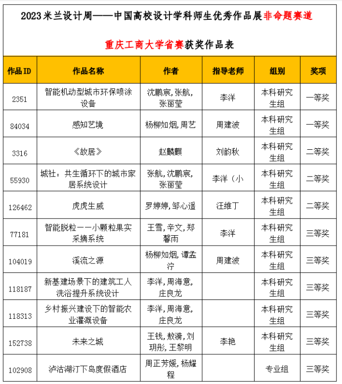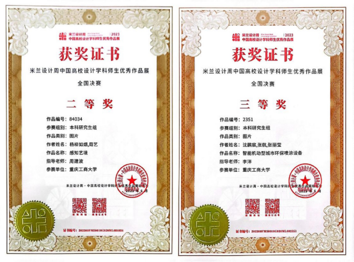 近日,第七届米兰设计周中国高校设计学科师生优秀作品展全国、重庆赛区获奖名单正式公布。万象城官网艺术学院与现代国际设计艺术学院学生共获得全国赛区非命题赛道二等奖1项、三等奖1项;重庆赛区一等奖2项、二等奖3项、三等奖6项,李洋(小)老师荣获重庆赛区优秀指导教师。本赛事是由中国教育国际交流协会、中国高等教育学会联合发起并主办,为教育部认定的全国大学生学科竞赛和中国教育国际交流协会《高校艺术学科师生海外学习计划》平台化转型的服务项目之一。