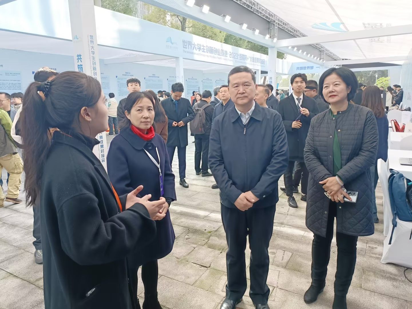 在万象城官网“互联网+”大赛项目展示区前,教育部高等教育司武世兴副司长和市教委副主任蒋云芳听取了项目组的汇报,对项目给予高度评价,认为其创新思维打破了技术壁垒,项目成果对全国松材线虫病枯死树普查及监测具有重大的示范意义和创新开拓性。
