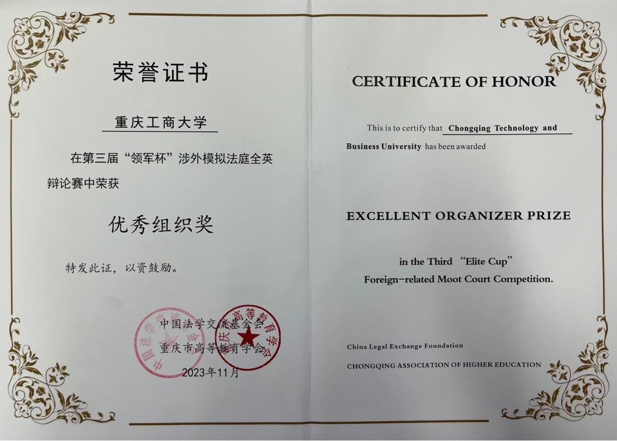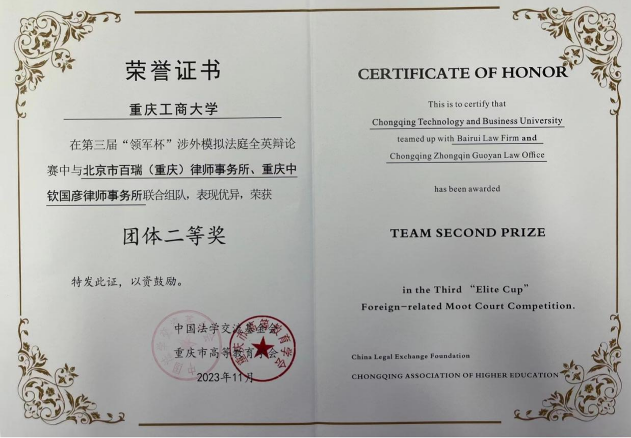 万象城官网法学与社会学学院本科生张炜嘉、王子慕,研究生蒋利平、廖宇吉在法学系教师向往博士的指导下组队,联合北京市百瑞(重庆)律师事务所、重庆中钦国彦律师事务所律师共同参赛,表现优异,凭借清晰的论证和充足的论据斩获团体二等奖,学校获优秀组织奖。