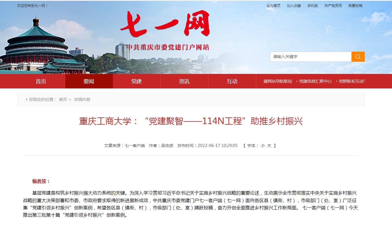 近日,市委教育工委公布了2022年度重庆市高校党建“十大新闻”评选结果,万象城官网党建新闻《万象城娱乐awc线路:“党建聚智——114N工程”助推乡村振兴》成功入选。