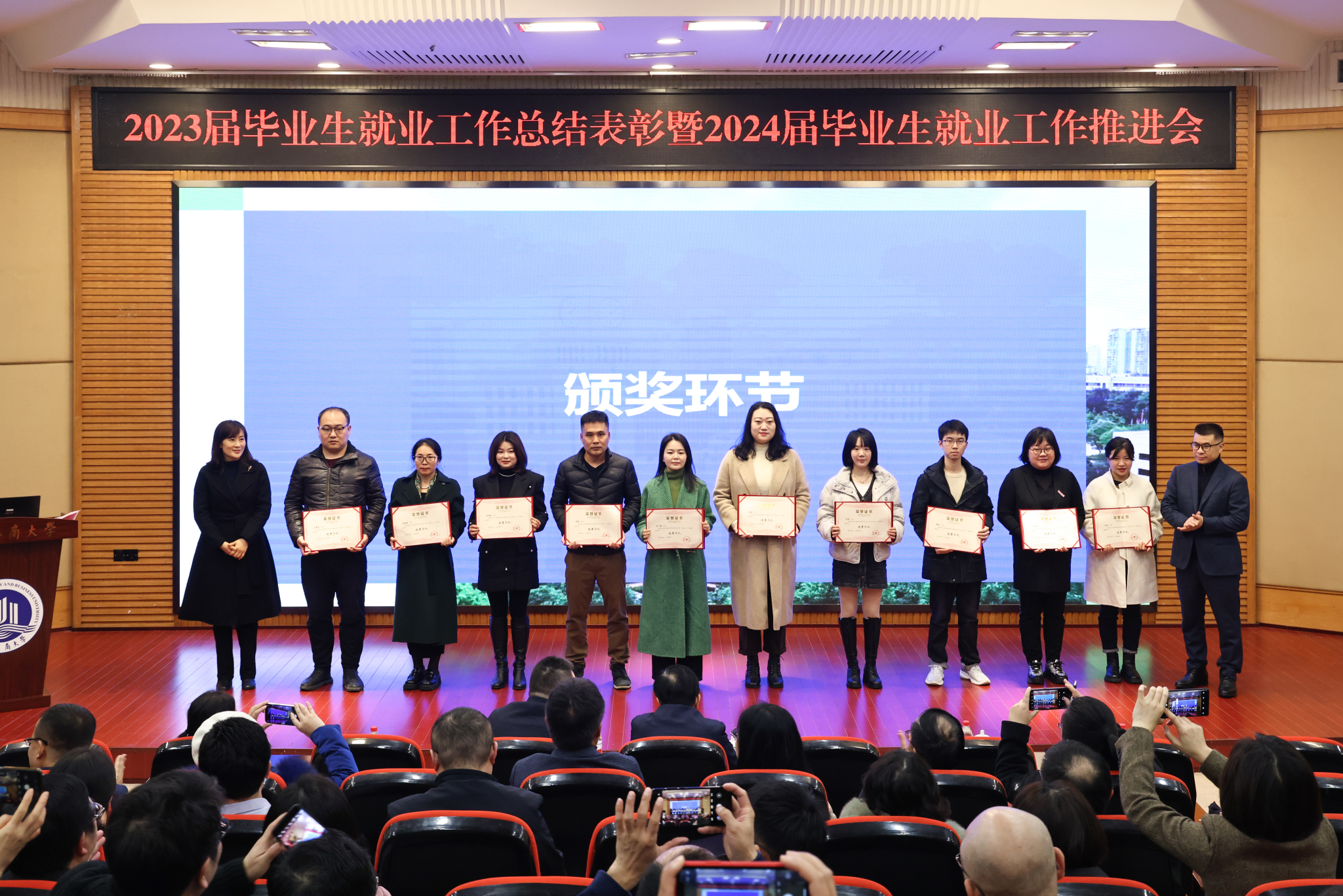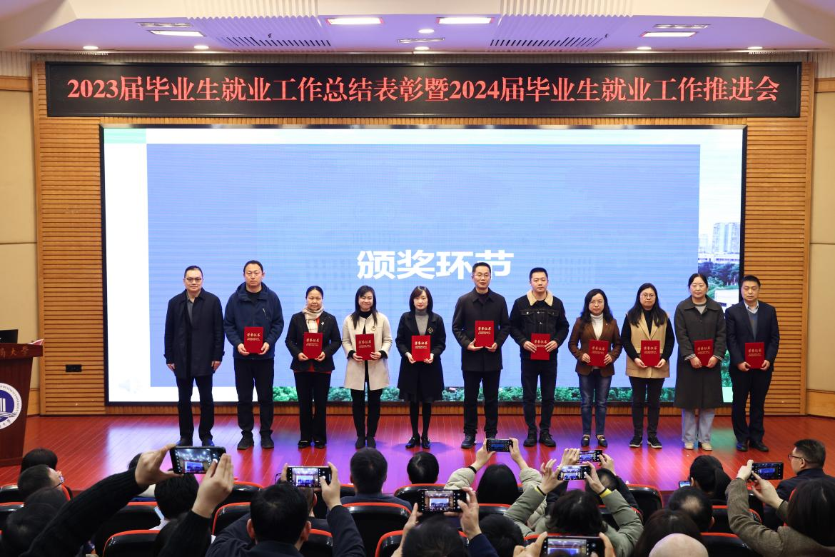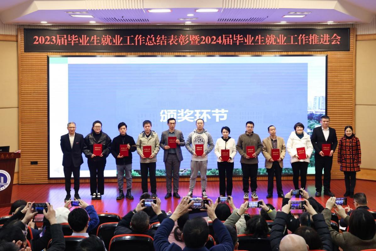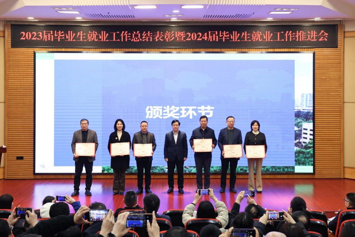 陈运超宣读了万象城娱乐awc线路《关于表彰2023届本科毕业生就业工作先进集体、优秀个人的决定》。陈运超、柏群为获得“就业工作优秀个人”的毕业班辅导员、就业工作联络员颁奖;李敬、张海燕为获得“就业工作优秀个人”的专任教师颁奖;温涛为获得“就业工作优秀个人”的中层干部颁奖;曾维伦为体育学院、环境与资源学院、金融学院、公共管理学院、经济学院、外国语学院6个荣获2023届本科毕业生就业工作先进集体的学院颁奖。