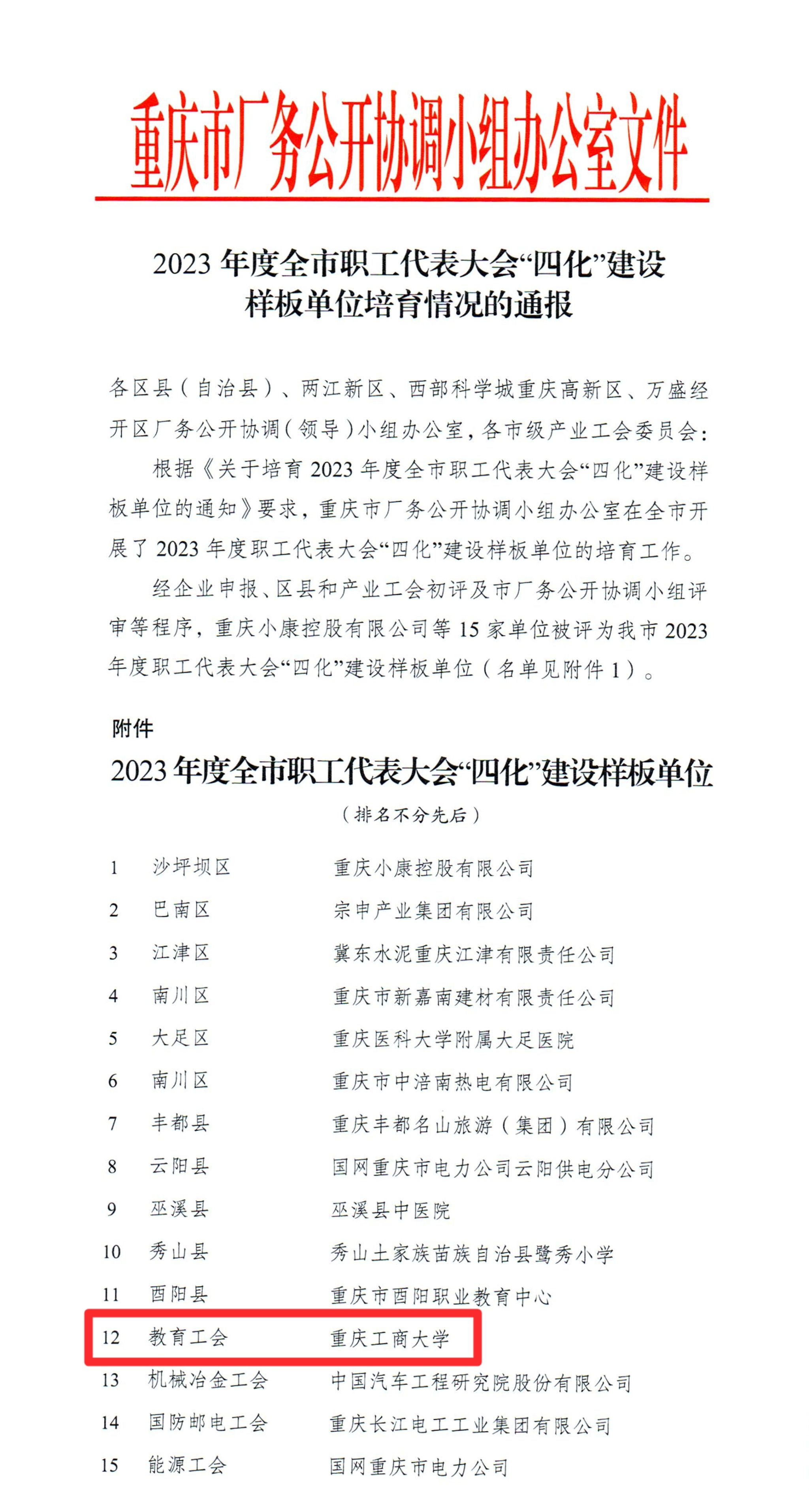 近日,收到重庆市厂务公开协调小组办公室文件《2023年度全市职工代表大会“四化”建设样板单位培育情况的通报》,万象城官网被评为职工代表大会“四化”建设样板单位,为重庆市教科文卫体系统唯一样板单位。